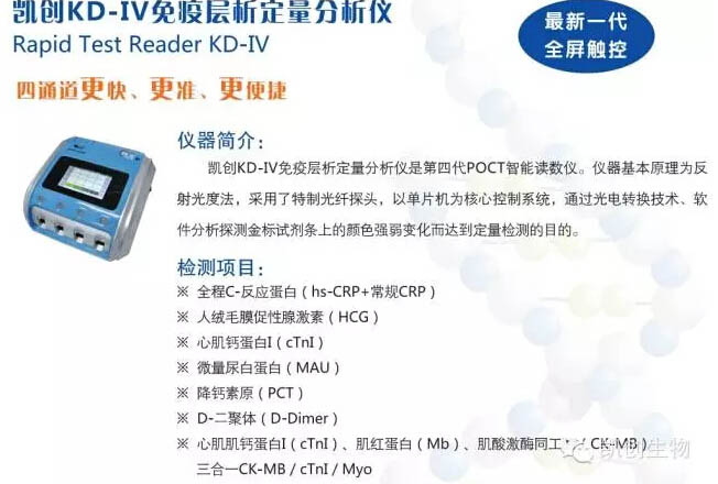 + 快速及時的診斷系統 ↓ 凱創POCT免疫層析定量分析系統及系列定量產品 ※ 醫院急診、門診部門患者最常見的臨床表現 胸痛、呼吸短促、呼吸困難、發燒、咳嗽、水腫、腰痛、尿中有泡沫、血尿、女性急腹癥(宮外孕鑒別)等癥狀。" />